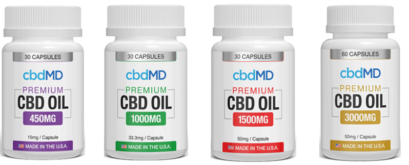 - CBD Oil Capsules. cbdMD sells CBD capsules in five strengths. Each capsule contains between 15 to 50 milligrams of CBD, with a base of MCT oil.